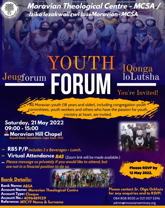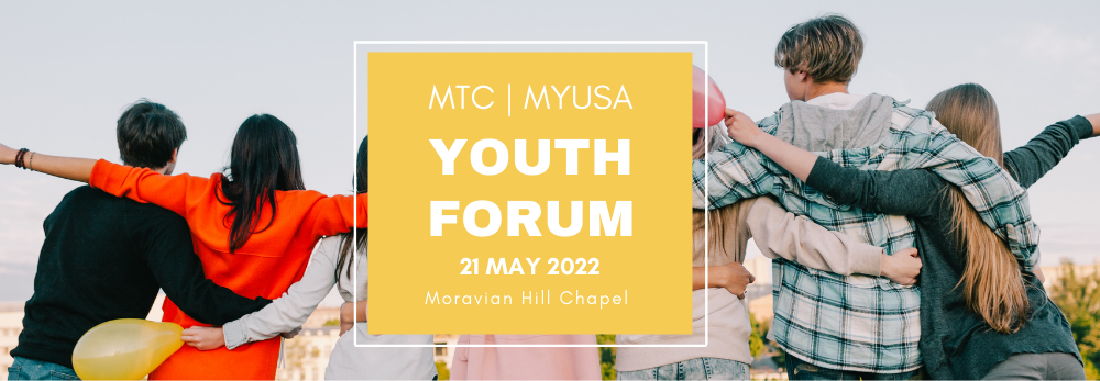 MTC and MYUSA Youth Forum by MoravChurch | May 3, 2022 | News Moravian Theological Centre – MYUSA Youth Forum Saturday, 21 May 2022 | 9am – 3pm | Moravian Hill Chapel EVENT LETTER